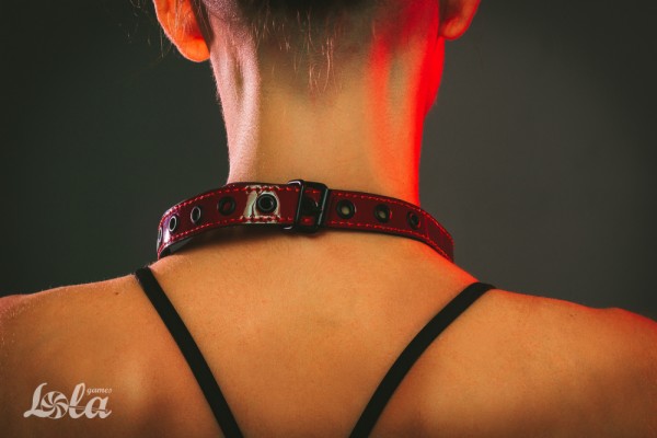 ПВХ, диаметр - 4,5см, на красном лакированном ремешке