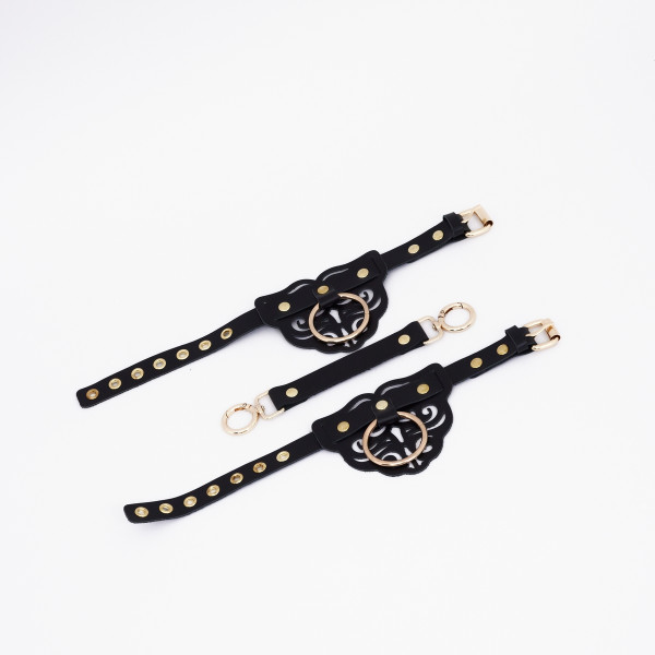 Выполнены наручники из натуральной кожи в лаконичном черном цвете. Фигурные вырезы на манжетах придают образу особенный шарм и подчеркивают нежность женских запястий. Золотая фурнитура придает образу особенную пикантность и подчеркивает отличный вкус владельца!