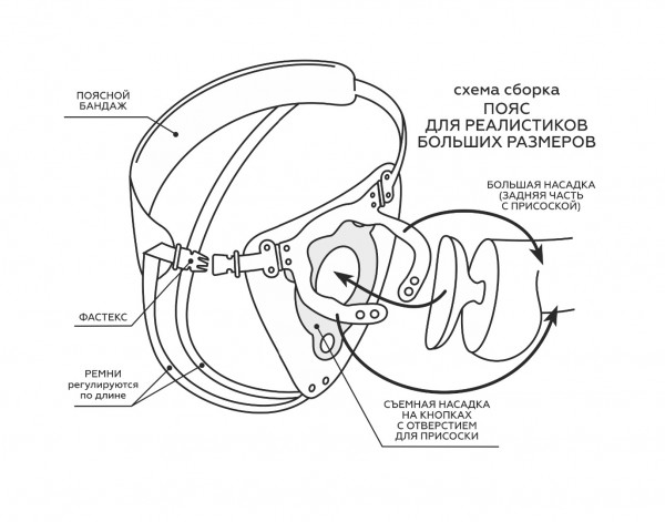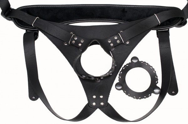 Трусики с широким кольцом и специальным дополнительным фиксатором. Вся система регулируемая. Металлические кнопки позволяют надежно фиксировать огромные фаллосы